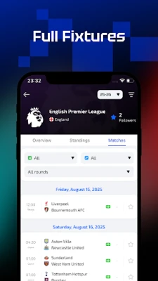 AiScore-এর মাধ্যমে আপনি সারা বিশ্বের হাজার হাজার ম্যাচের প্রতিটি স্কোর এক নজরে দেখতে পারবেন। রিয়েল টাইমে আজকের সমস্ত ম্যাচ ট্র্যাক করুন, অথবা DateTime Picker ব্যবহার করে যেকোনো নির্দিষ্ট দিনের ম্যাচের সময়সূচী যাচাই করুন। আপনার পছন্দের দল বা প্রতিযোগিতা নির্বাচন করে একটি ব্যক্তিগতকৃত অভিজ্ঞতা উপভোগ করুন, যাতে আপনি সর্বদা সর্বশেষ আপডেটের সঙ্গে যুক্ত থাকতে পারেন। গোল, কর্নার, লাল বা হলুদ কার্ড, ম্যাচের শুরু এবং চূড়ান্ত ফলাফল সম্পর্কে তাত্ক্ষণিক বিজ্ঞপ্তি পান। "স্কোর রিমাইন্ডার" চালু থাকলে, স্কোর পরিবর্তন হওয়ার সাথে সাথে একটি পপ-আপ উইন্ডো আপনাকে অবহিত করবে।
