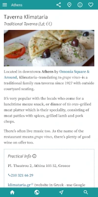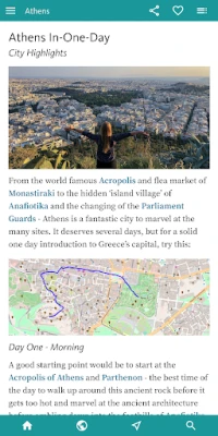 এই অ্যাপটি ব্যবহারকারীদের জন্য দ্রুত এবং কার্যকরী নেভিগেশন সুবিধা প্রদান করে, যেখানে অসংখ্য ছবি বোতাম, একটি গ্লোবাল সার্চ অপশন এবং ইন্টারনাল হাইপারলিঙ্ক ব্যবহার করা হয়েছে। আপনার ডিভাইসের জিপিএস ব্যবহার করে এটি সঠিক লোকেশন তথ্য সরবরাহ করতে সক্ষম। অর্থপ্রদত্ত সংস্করণে বিস্তারিত অফলাইন ম্যাপ এবং নিজের মার্কার যোগ করার সুবিধা রয়েছে। আপনার পছন্দের স্থানগুলি সংরক্ষণ এবং অন্যদের সাথে শেয়ার করতে পারবেন, এছাড়াও এক ক্লিকে ওয়েবসাইট লিঙ্ক এবং ফোন কলের সুযোগ রয়েছে। অ্যাপটির বিষয়বস্তু লিখেছেন রেবেকা হল, যিনি এক দশক ধরে গ্রিসে বসবাস করেছেন এবং একজন স্বনামধন্য ভ্রমণ লেখক হিসেবে তার গভীর অভিজ্ঞতা এই গাইডটিকে আরও সমৃদ্ধ করেছে।