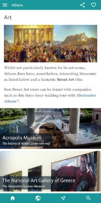 প্রথমবার অ্যাথেন্স পরিদর্শনে আসা পর্যটকদের জন্য 'ATHENS' BEST' হাতে গড়া ভ্রমণসূচি তৈরি করে, যা আপনাকে এক বা দুই দিনের মধ্যে শহরটি অন্বেষণ করার সুযোগ দেবে, পাশাপাশি কিছু স্থানীয়দের পছন্দের ট্যুরের সুপারিশও প্রদান করে। আপনি যদি নির্দিষ্ট কোনো বিষয়ে আগ্রহী হন, যেমন গ্রিক শিল্পকলা বা দীর্ঘদিনের ইতিহাস, তাহলে সরাসরি 'আগ্রহ ও কার্যক্রম' অংশে প্রবেশ করতে পারেন। এখানে শিল্প, হাইকিং এবং শিশুদের উপযোগী কার্যকলাপের মতো বিভিন্ন বিভাগ রয়েছে। এছাড়াও, গুরুত্বপূর্ণ দর্শনীয় স্থানগুলির আশেপাশে সেরা রেস্তোরাঁ ও ক্যাফে খুঁজে পেতে এবং অ্যাথেন্সের সেরা স্যুভেনিয়ার কেনাকাটার জন্য একটি বিস্তারিত নির্দেশিকাও এই অ্যাপে অন্তর্ভুক্ত করা হয়েছে।