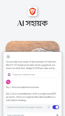 Brave আপনাকে দিচ্ছে একটি দ্রুত, নিরাপদ এবং ব্যক্তিগত ইন্টারনেট অভিজ্ঞতার প্রতিশ্রুতি। ডিজিটাল জগতে যেখানে আপনার ডেটা মূল্যবান, সেখানে Brave ব্রাউজার একটি নতুন দিগন্ত উন্মোচন করে। সম্প্রতি যুক্ত হয়েছে Brave Leo, যা আপনার ব্রাউজারের মধ্যেই একটি বিনামূল্যে কৃত্রিম বুদ্ধিমত্তা চালিত সহায়ক। এটি আপনাকে প্রশ্নের উত্তর দিতে, ভাষার অনুবাদ করতে এবং বিভিন্ন সৃজনশীল কাজে সহায়তা করতে প্রস্তুত। এই অসাধারণ ফিচারের পাশাপাশি, Brave নিজস্ব সার্চ ইঞ্জিন দ্বারা চালিত, যা বিশ্বজুড়ে সবচেয়ে সম্পূর্ণ, স্বাধীন এবং আপনার গোপনীয়তাকে অগ্রাধিকার দেয় এমন একটি অনুসন্ধান অভিজ্ঞতা নিশ্চিত করে।